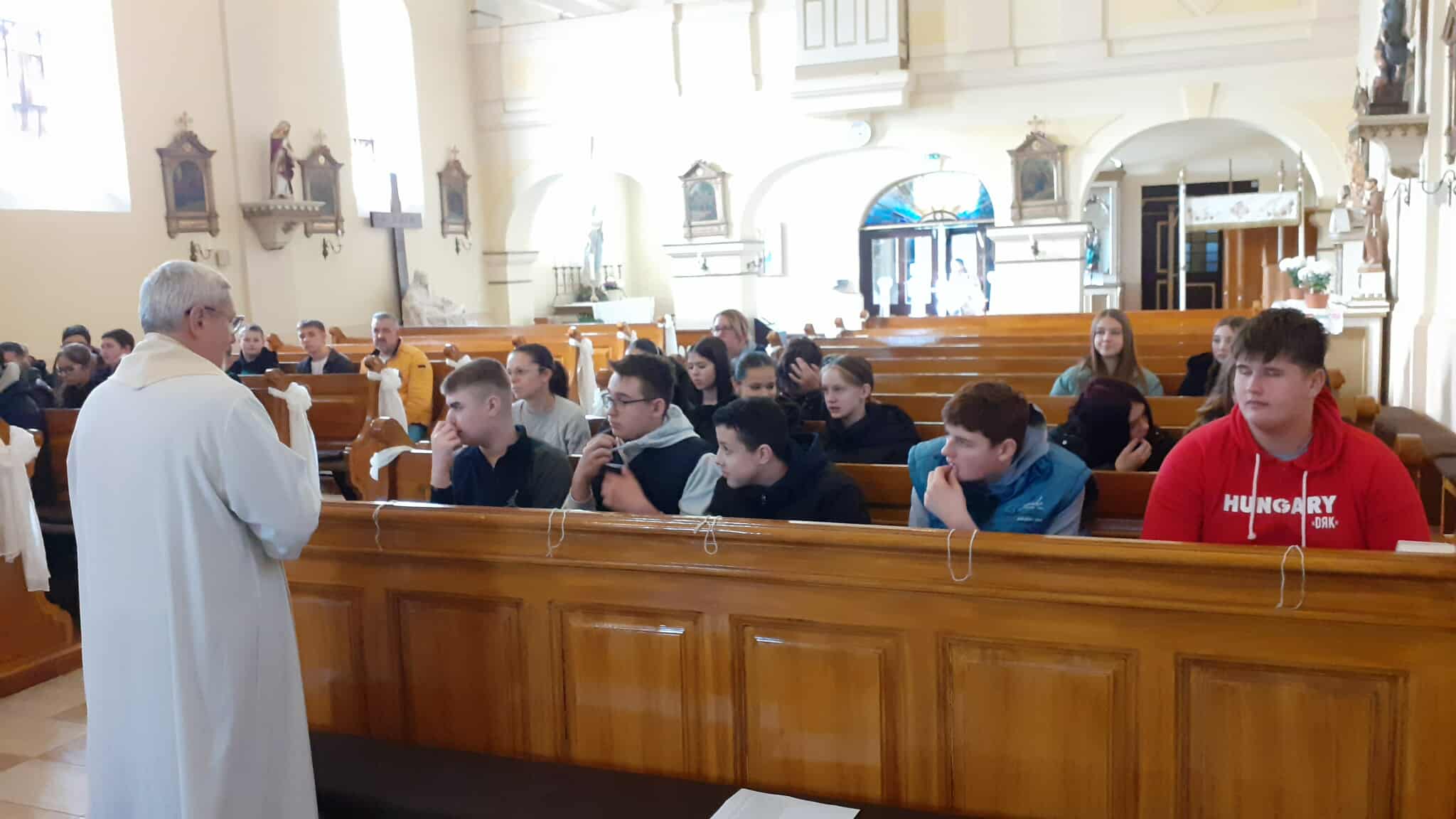Az Ásotthalomról, Domaszékről, Röszkéről, Ruzsáról, Zákányszékről és Mórahalomról érkezett, főleg 7-8. osztályos diákokkal a Szent László Király templomban találkoztunk, ahol István atya köszöntőjét követően rövid szentségimádással kezdtük a találkozót. Az elmélkedések Szent Carlo Acutis és Boldog Bódi Mária Magdolna életéből idézték olyan gondolatokat, amik bemutatták az Oltáriszentség fontosságát és a Jézussal való személyes kapcsolatukat. Énekekkel és gitárral a domaszéki fiatalok kísérték a szentségimádást.